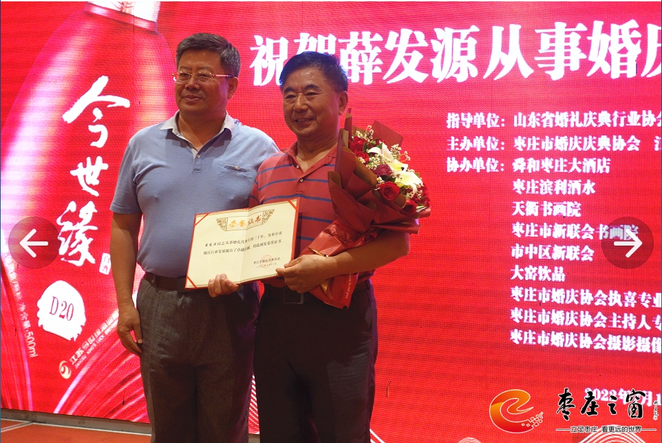 在專委會成立一周年之際,為了更好地開展工作,棗莊市婚慶慶典協(xié)會特舉辦專委會成立1周年慶典暨婚慶產(chǎn)業(yè)鏈融合發(fā)展座談會。原棗莊市兩新組織黨工委副書記、市民政局一級調(diào)研員叢方佐在座談會上致賀詞,山東省婚禮慶典行業(yè)協(xié)會、棗莊市婚慶慶典協(xié)會、江蘇今世緣酒業(yè)銷售有限公司、舜和棗莊大酒店、棗莊濱利酒水、天衢書畫院、棗莊市新聯(lián)會書畫院、市中區(qū)新聯(lián)會、大窯飲品、棗莊市婚慶協(xié)會執(zhí)喜專業(yè)委員會、棗莊市婚慶協(xié)會主持人專業(yè)委員會、棗莊市婚慶協(xié)會攝影攝像專業(yè)委員會等代表在座談會發(fā)言,對棗莊婚慶行業(yè)與相關(guān)婚慶產(chǎn)業(yè)的融合發(fā)展提出建議和期望。周年慶還給從事婚慶行業(yè)三十周年的薛發(fā)源同志頒發(fā)卓越成就獎,同時,專委會專家顧問團新聘任7位同志為執(zhí)喜專業(yè)委員會顧問,進一步提高了專委會的專業(yè)水平,在今后為廣大群眾提供更好的專業(yè)化服務(wù)。(楊仁成  攝影)
